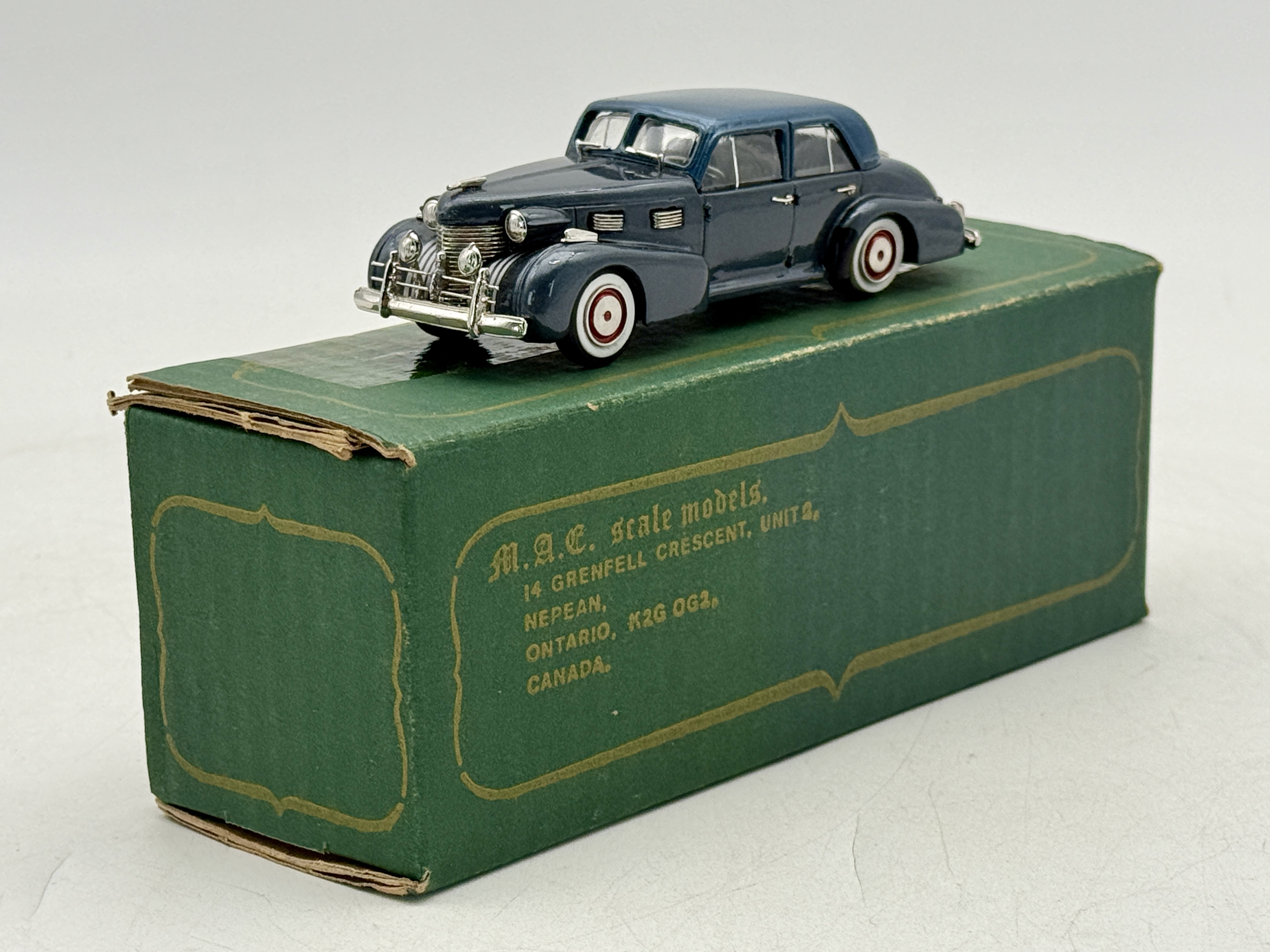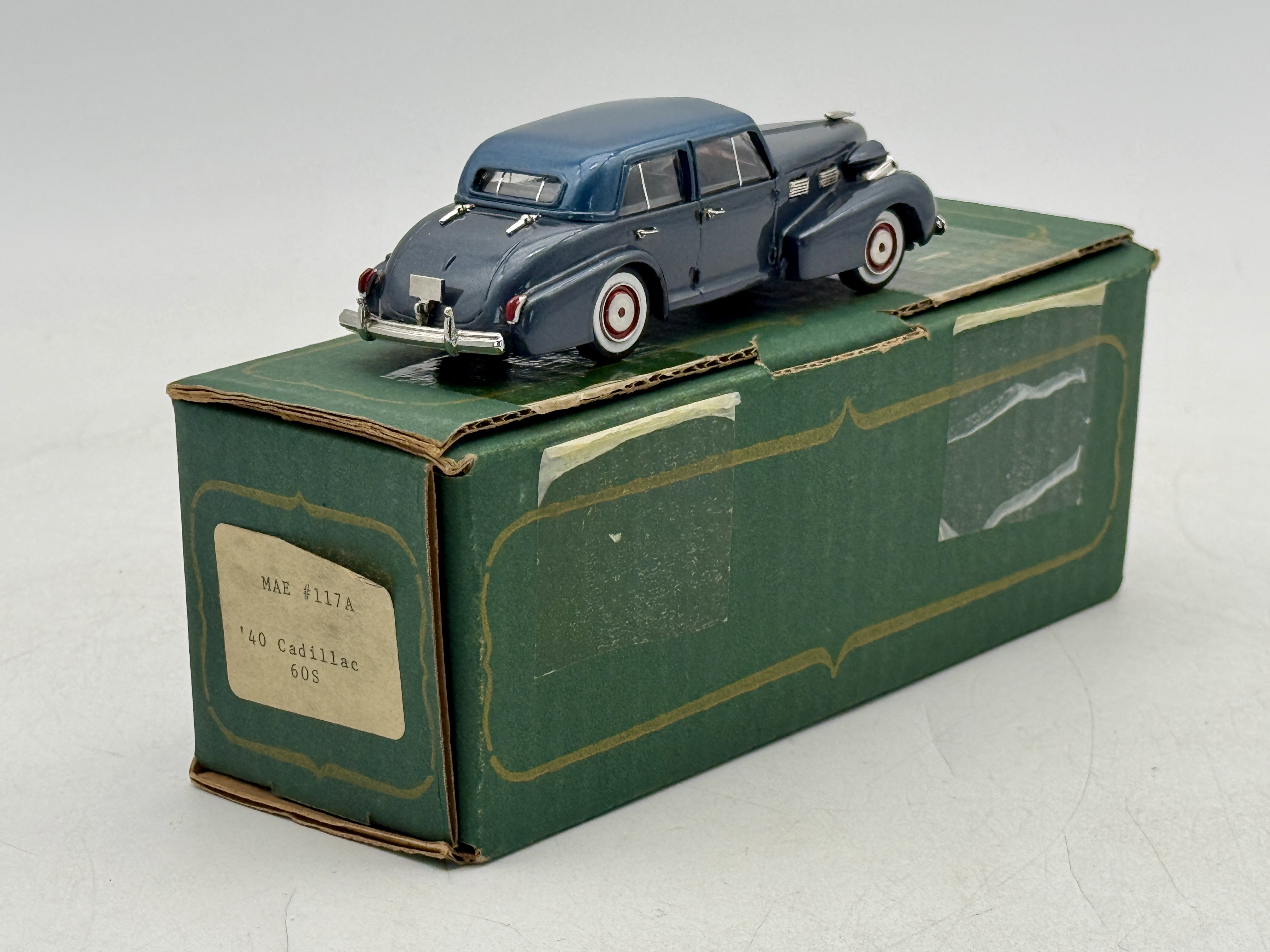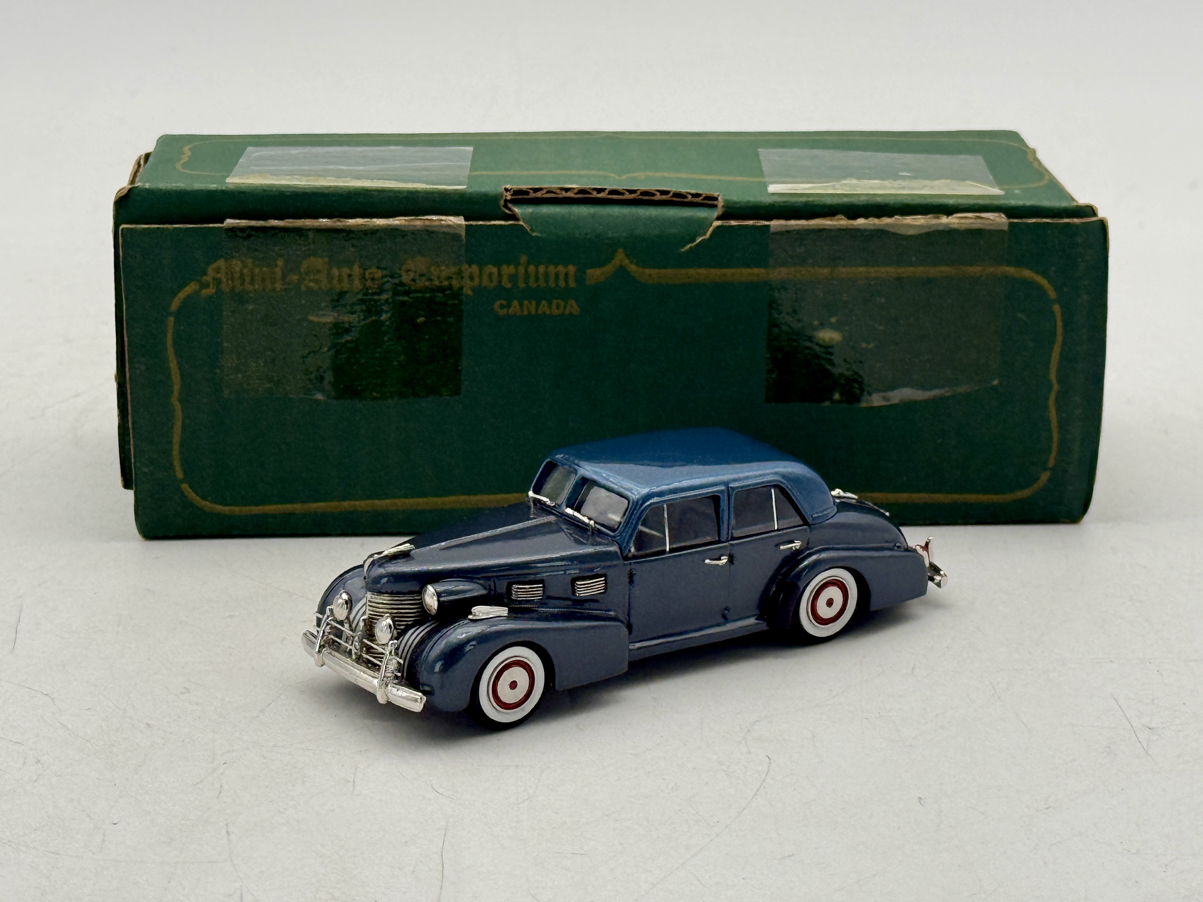 A blue 1940 Cadillac 60S scale model car, identified as MAE #117A, accompanied by its original green Mini-Auto Emporium Canada box. White metal 5″ two-tone blue. OB MW C9