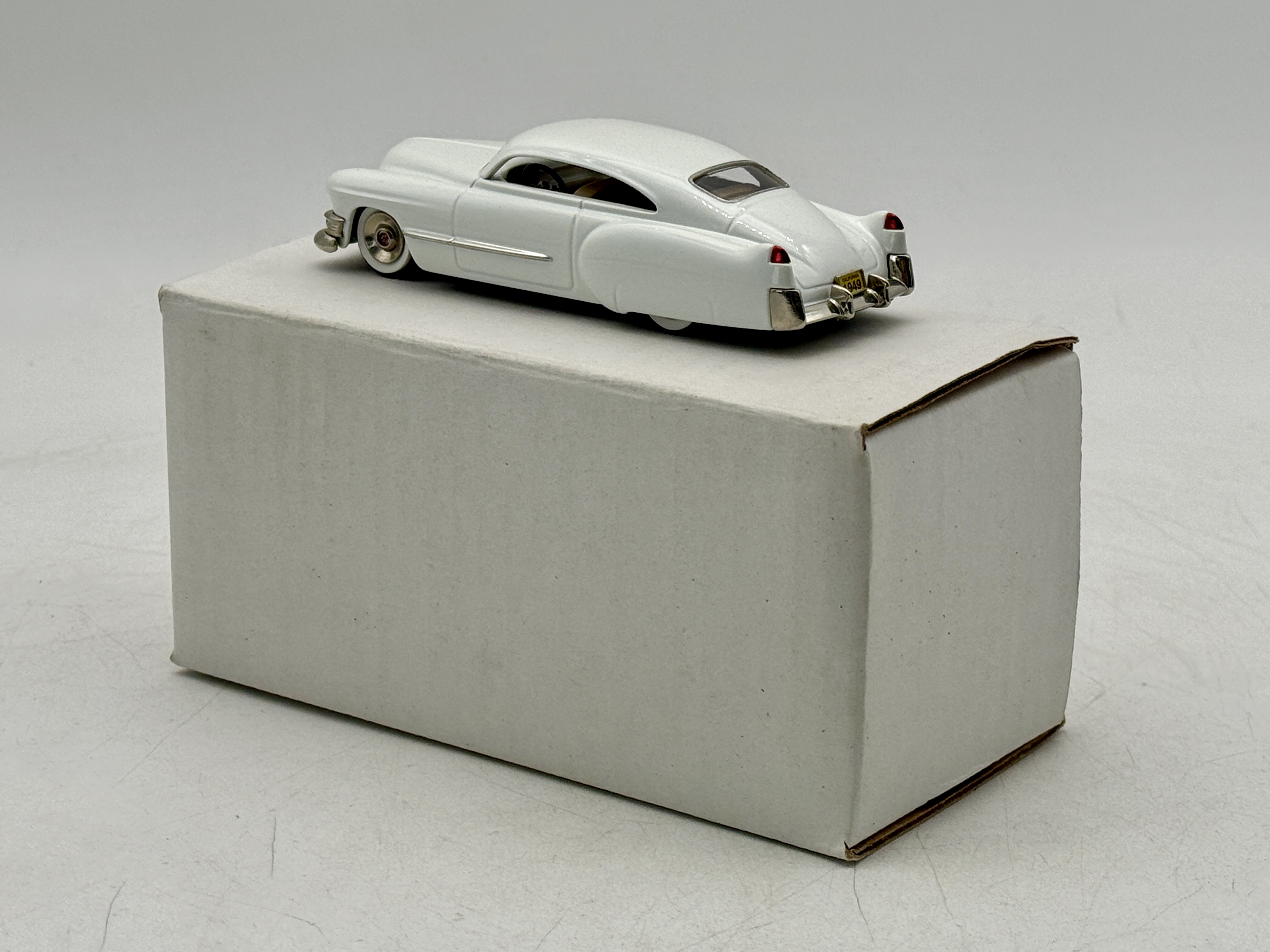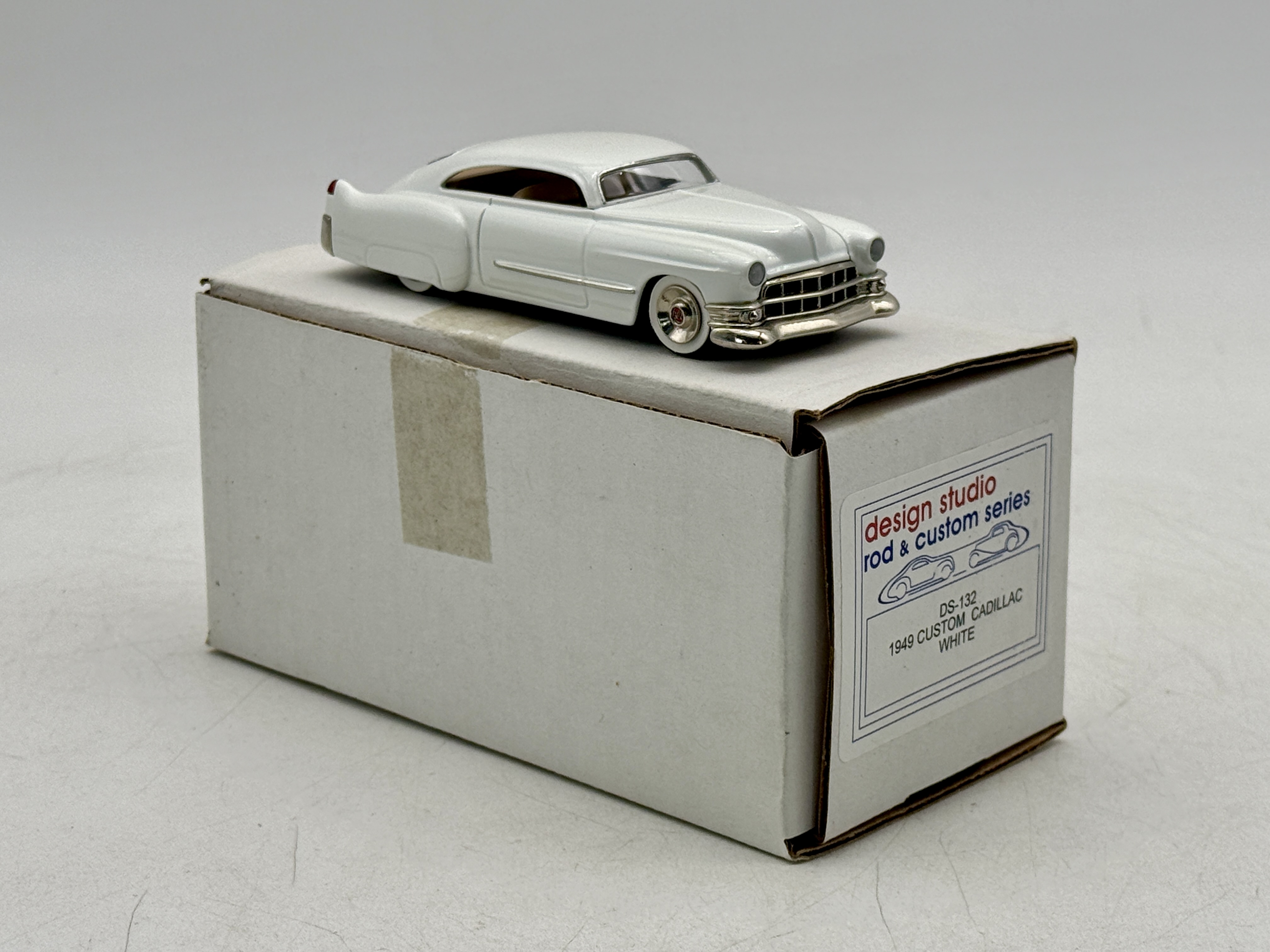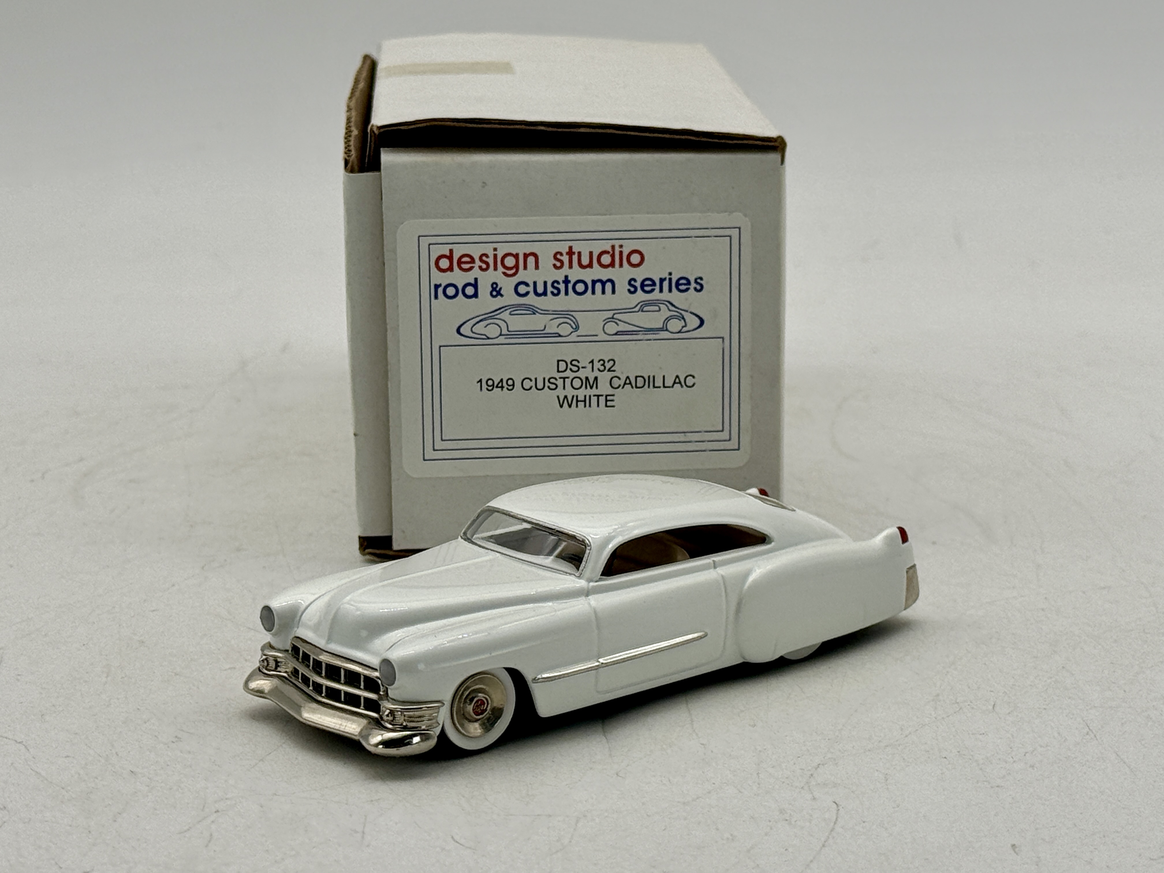 A white metal, white 1949 custom Cadillac scale model car from the Design Studio Rod and Custom Series DS-132 with its original labeled box. OB C9