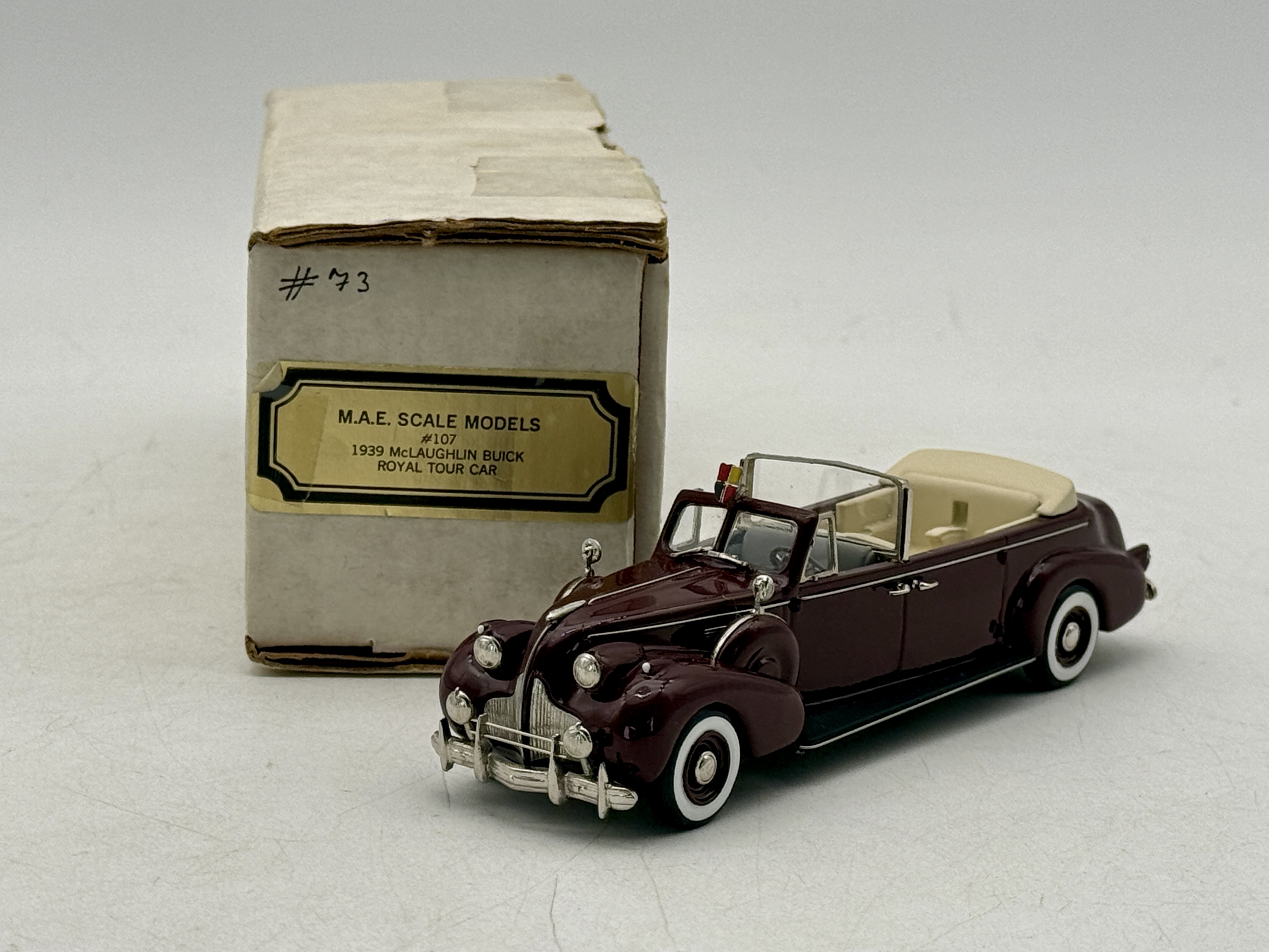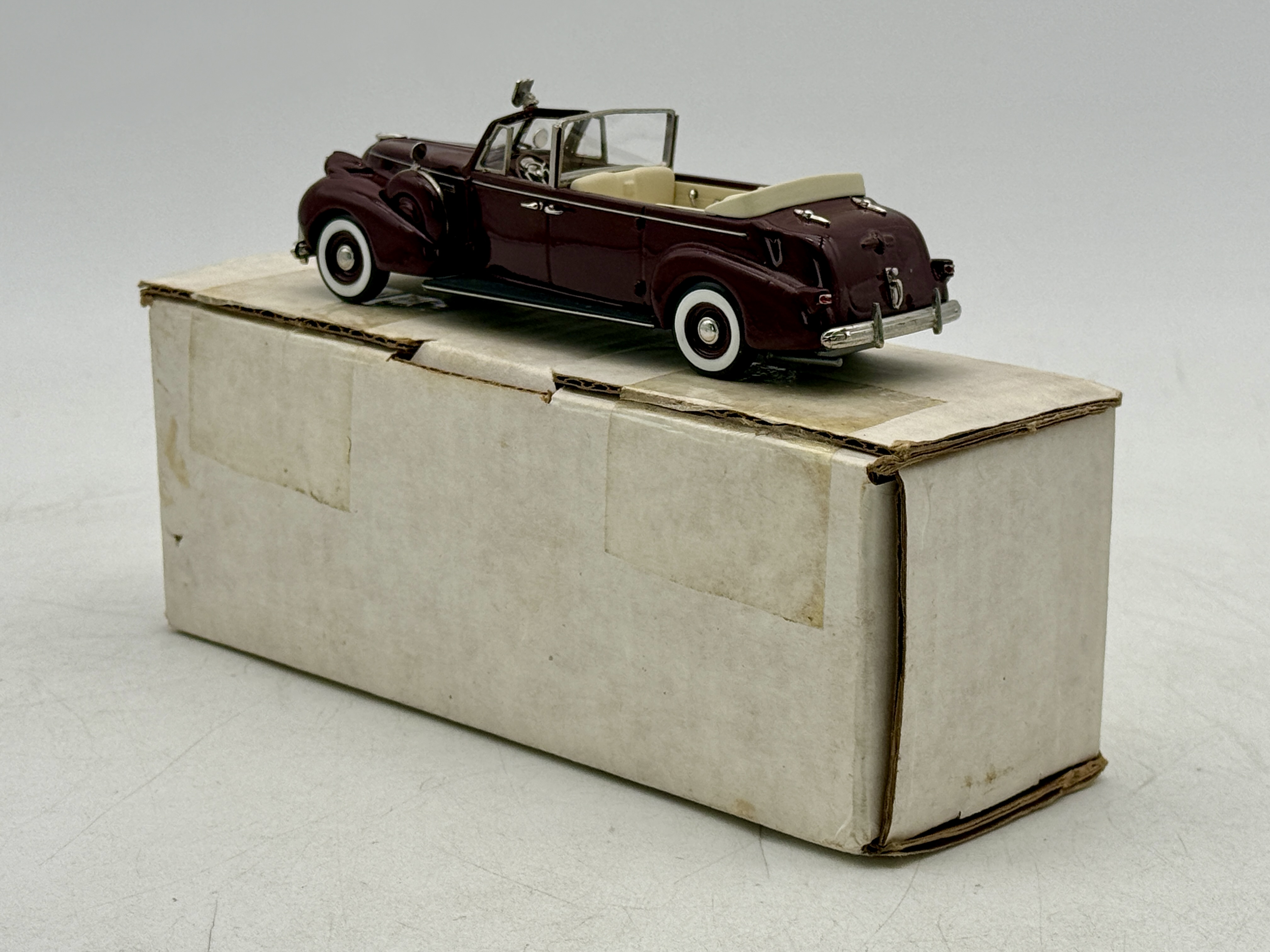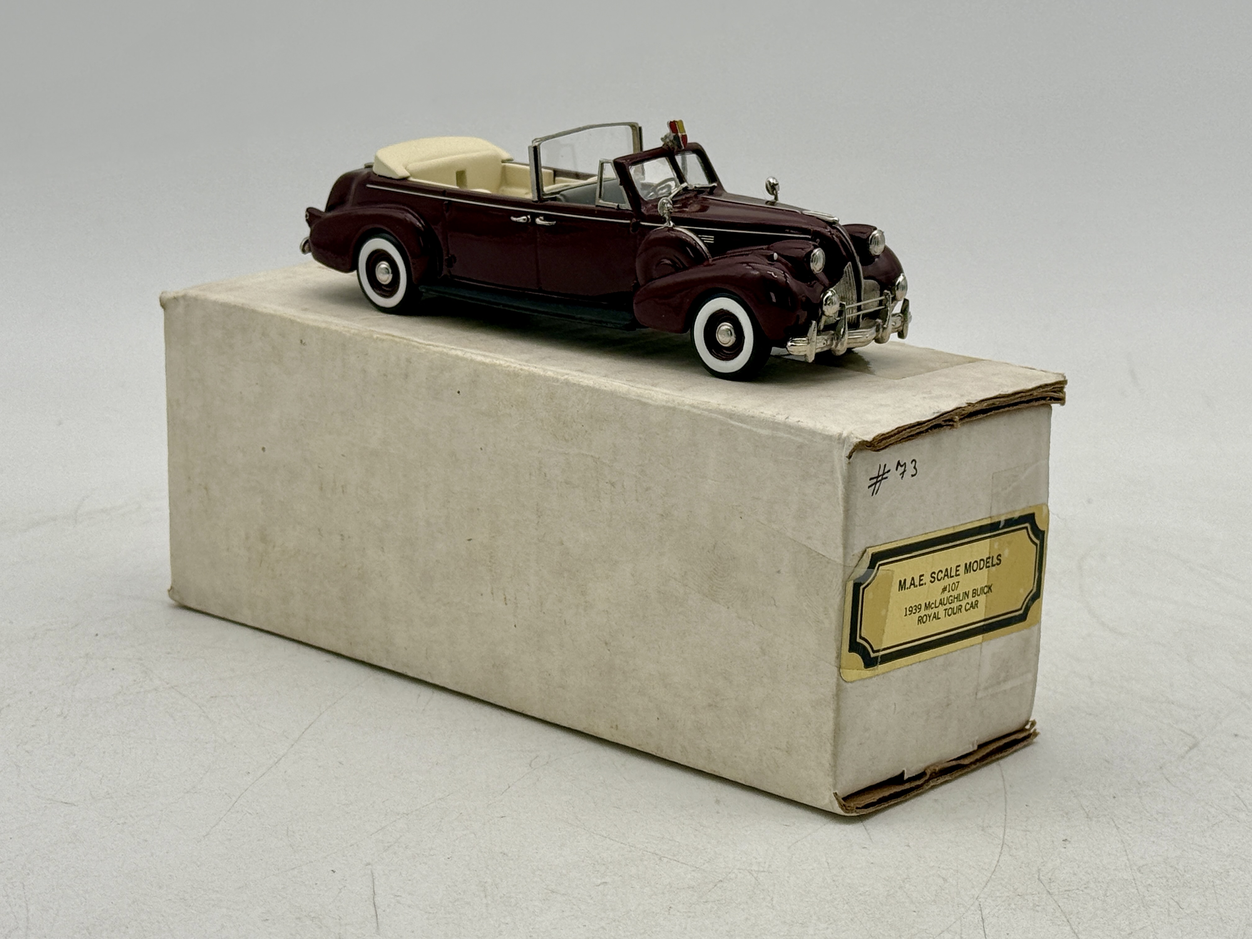 A maroon 1939 McLaughlin Buick Royal Tour Car scale model featuring a cream interior and whitewall tires, accompanied by its original box. White metal, 5 1/2 inches, OB C9